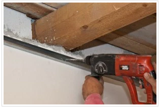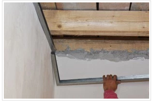 - Langkah berikutnya adalah pemasangan wall angle (siku metal) sebagai penyangga metal furing. Tempatkan siku metal pada tanda garis. Selalu mulai dengan dinding dengan luas terpanjang. Bor siku metal dengan jarak antar baut/sekrup 40 cm. Pastikan siku dibaut dengan kencang agar kuat menyangga metal furing.