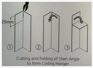 Selain bracket dan rod hanger, penggantung plafon juga dapat menggunakan besi siku yang sudah berfungsi sebagai kawat penggantung dan pada ujungnya dilipat agar dapat berfungsi sebagai bracket (lihat gambar).