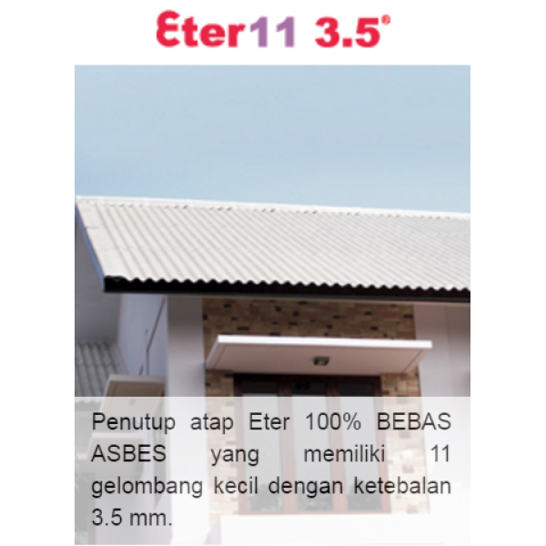 Eter 11 3.5® adalah produk penutup atap fiber semen gelombang kecil memiliki 11 gelombang dengan ketebalan 3.5 mm. Eter 11 3.5® adalah produk yang paling ekonomis diantara produk eter 6 5®.