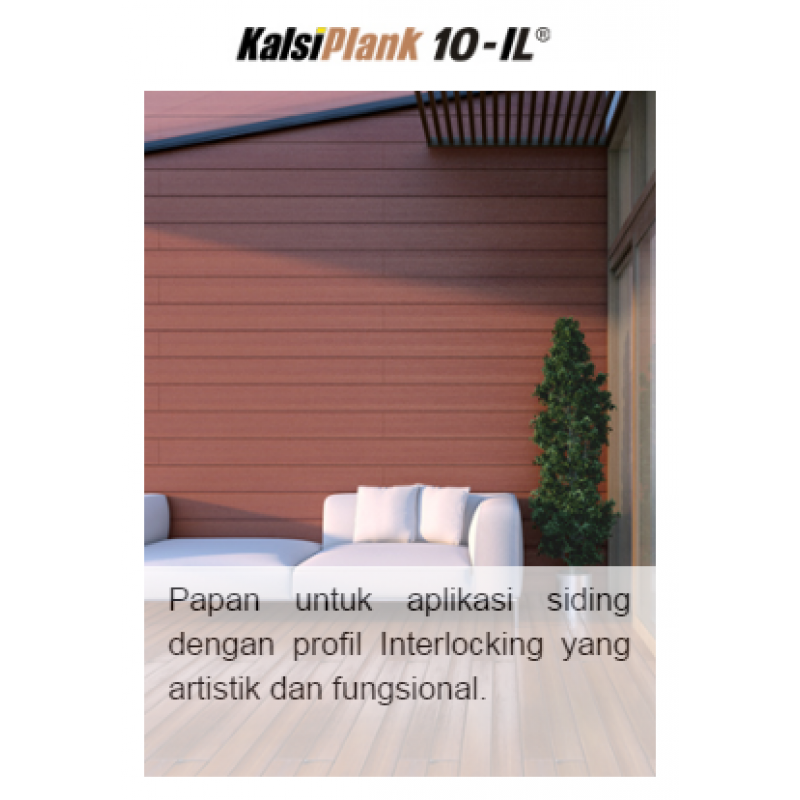 KalsiPlank 10-IL adalah papan dekoratif untuk pelapis dinding luar dengan ketebalan 10 mm sebagai lapisan dinding luar dan dekorasi dinding dalam memiliki fitur profil interlocking khusus yang artistik dan berfungsi juga sebagai tali air. KalsiPlank 10-IL diaplikasikan dengan memasang sekrup KalsiScrew PC pada rangka metal. Untuk penyelesaian akhir gunakanlah produk cat yang sesuai (contoh: cat berbahan dasar air dan minyak yang khusus digunakan untuk aplikasi luar). Keuntungannya adalah kuat, handal, sistem pemasangan yang mudah, bersih, fleksibel dan 100% bebas asbes.