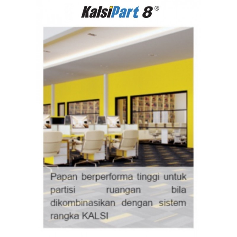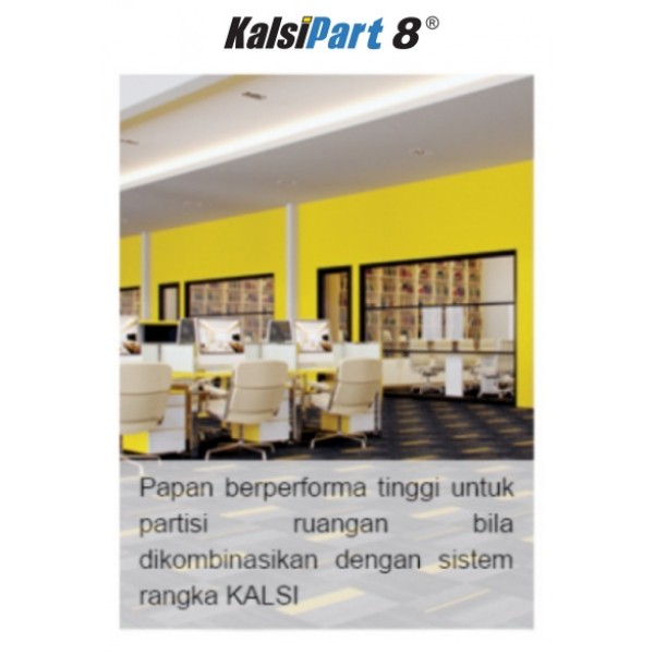 KalsiPart 8 adalah papan fiber semen untuk aplikasi dinding dalam/partisi dengan ketebalan 8 mm. Sambungan antara papan KalsiPart 8 diaplikasikan dengan sistem sambungan terbuka atau sambungan tertutup dengan menggunakan KalsiKompon IN-F dan KalsiTape FG-50. KalsiPart 8 diaplikasikan pada rangka baja KalsiFrame MT-51 dan KalsiFrame MS-51 yang dipasang sesuai rekomendasi KALSI, sehingga akan diperoleh suatu sistem partisi lengkap yang memiliki daya tahan yang baik.