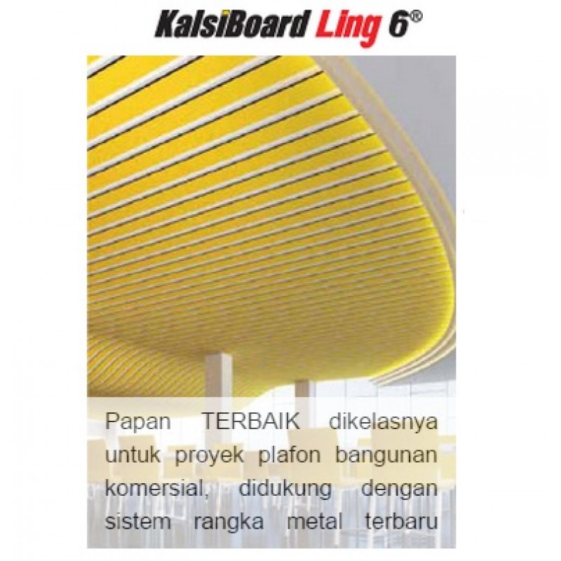 KalsiBoard Ling 6 merupakan papan plafon kami yang terbaik. Dengan ketebalan 6mm sangat cocok untuk plafon interior maupun exterior (soffit). Daya tahan KalsiBoard Ling 6 adalah yang terbaik dipasaran dan merupakan solusi tepat untuk aplikasi plafon terbaik. KalsiBoard Ling 6 akan menghasilkan plafon yang rata sempurna dengan sistem sambungan tertutup (flush joint).