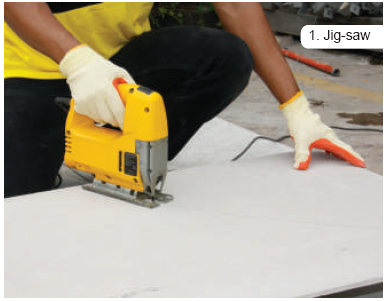 Pemotongan KALSI dengan ketebalan > 6 mm dilakukan dengan alat pemotong khusus. Alat potong yang dipakai alat potong listrik seperti Circular Saw, Jig saw, MalcoTools dan power tools lainnya. Untuk memudahkan pekerjaan dan mendapatkan hasil yang sempurna sebaiknya pemotongan dilakukan di atas lantai